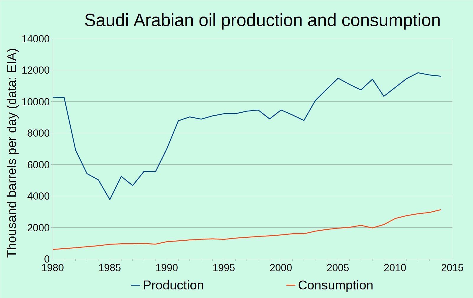To answer that, one must take another look at the situation in the Middle East, if not at its largest producer, Saudi Arabia. While Saudi Arabia's primary source of revenue is of course oil, according to Ahmed Saudi Arabia is expected to reach its peak of oil production by no later than 2028. But that isn't its only problem, because due to a significantly rising population which is adding to what are already rising internal consumption levels, Saudi Arabia has actually been exporting 1.4% less oil year upon year. While implying an earlier kind of peak, this of course doesn't bode well for those expecting Saudi Arabia to be their sweet-crude-daddy (which I'll get to in a moment), and will eventually impose upon Saudi Arabia a world of its own problems.