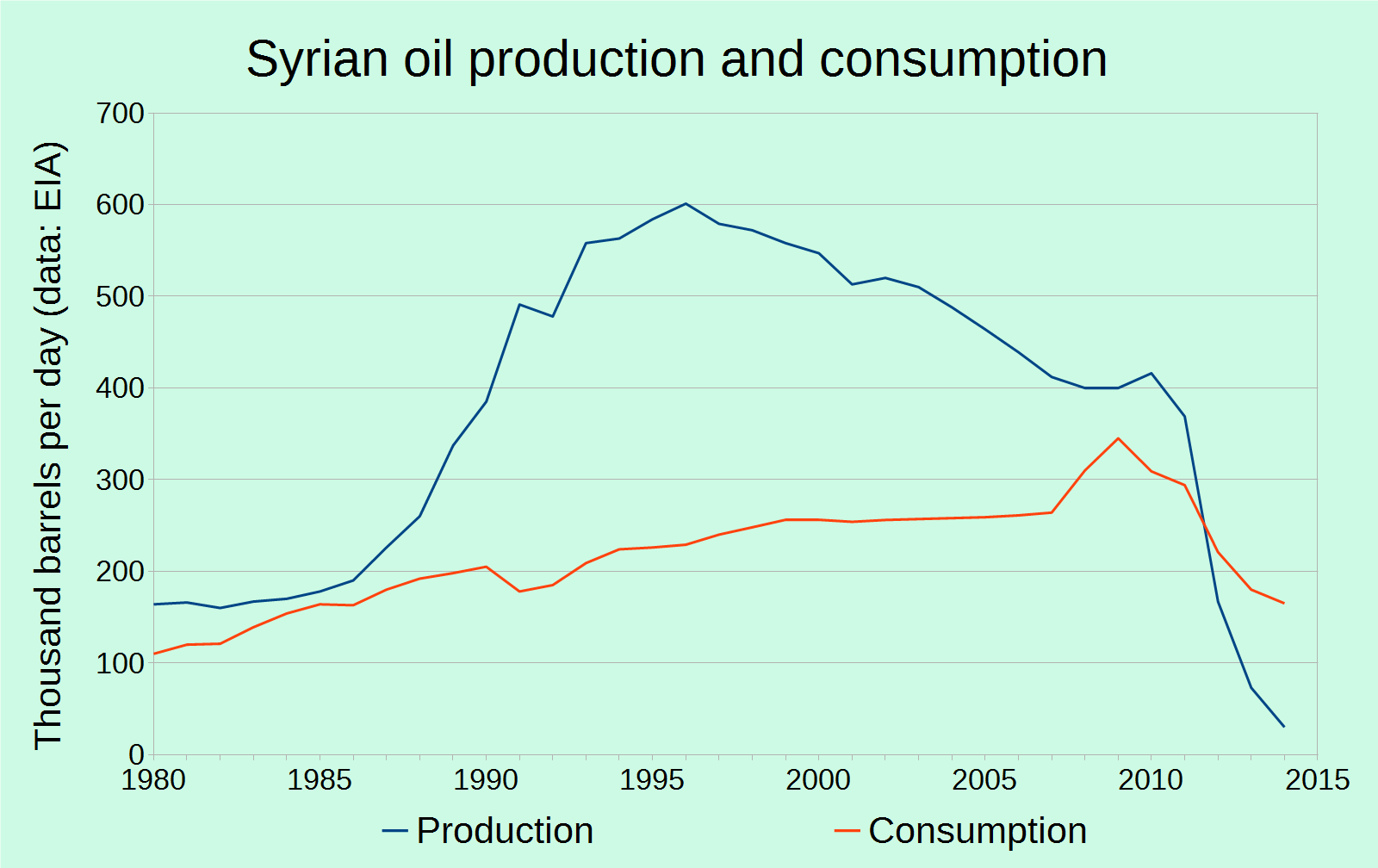 For starters, Syrian oil production peaked in 1996, dipped by almost half by 2010, and then plummeted again by even more than half upon the outbreak of war. With a dwindling influx of currency due to shrinking exports of crude, the government was forced to slash fuel subsidies in May of 2008, tripling petrol prices overnight and significantly driving up the price of food (a serious problem when food makes up an overwhelming part of your budget, and when what you eat is virtually nothing but staples). Ongoing drought conditions have only exacerbated poor harvests in what used to be a country self-sufficient in wheat, and so coupled with spiking food prices and Assad's inability to maintain subsidies due to dwindling influxes of foreign currency, the situation has only gotten worse, and then worse, and then worse.
