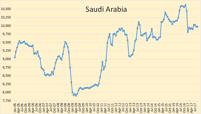 To put it a bit crudely (no pun intended), what the aforementioned implies is that Saudi Arabia and its monarchy are screwed. Because if Ron Patterson's recent conveyance over at Peak Oil Barrel that "Saudi production peaked in 2016 at 10,338 kbpd and their average production for 2017 is down 443 kbpd so far" is an indication that Saudi Arabia has already reached its all-time peak, then that means that Saudi Arabia's prospects aren't about to get better anytime soon. Or rather, ever.