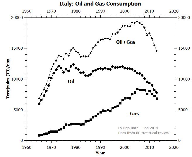 For a closer look, take a look at Italy. Oil and gas consumption peaked in 2004 and has been on a decline ever since. According to Ugo Bardi over at Resource Crisis, "Italy is in full collapse." One not only sees that industries are closing down, but also that restaurants are popping up in the attempt to attract the wallets of globe-trotting, placeless tourists, along with all the chic restaurant-hoppers. What is being witnessed, says Bardi, is "unreal."