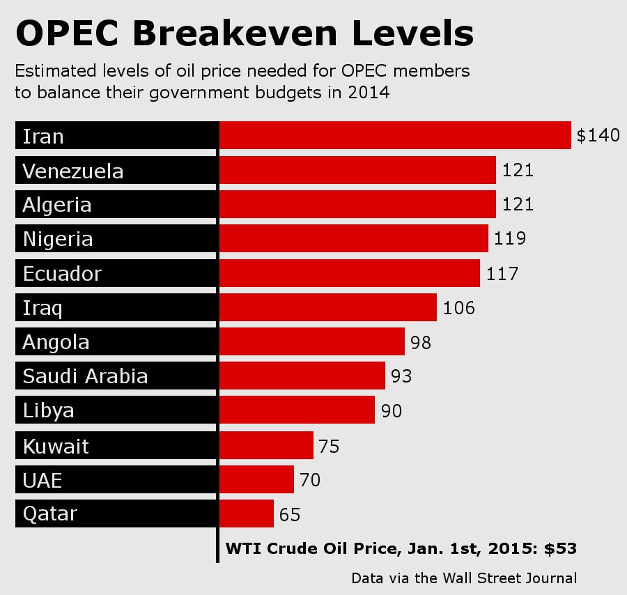First off, certain OPEC members – namely Saudi Arabia, the United Arab Emirates, and Qatar – have either built up such substantial financial reserves and/or can extract oil so cheaply that they are able to bear the brunt of low oil prices for some time. Not so much others.