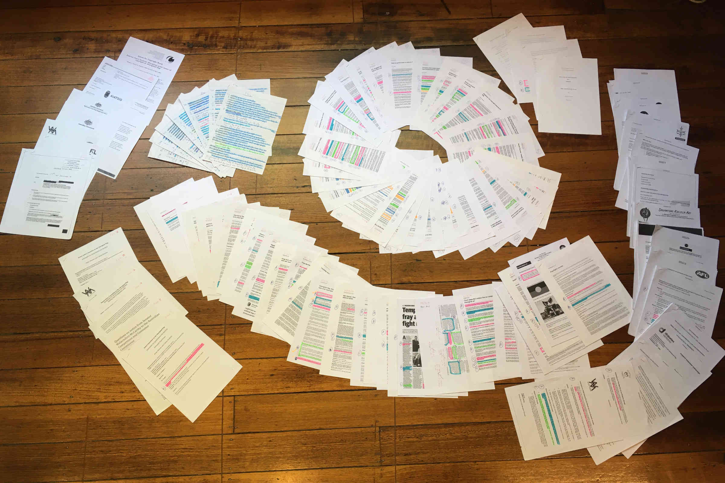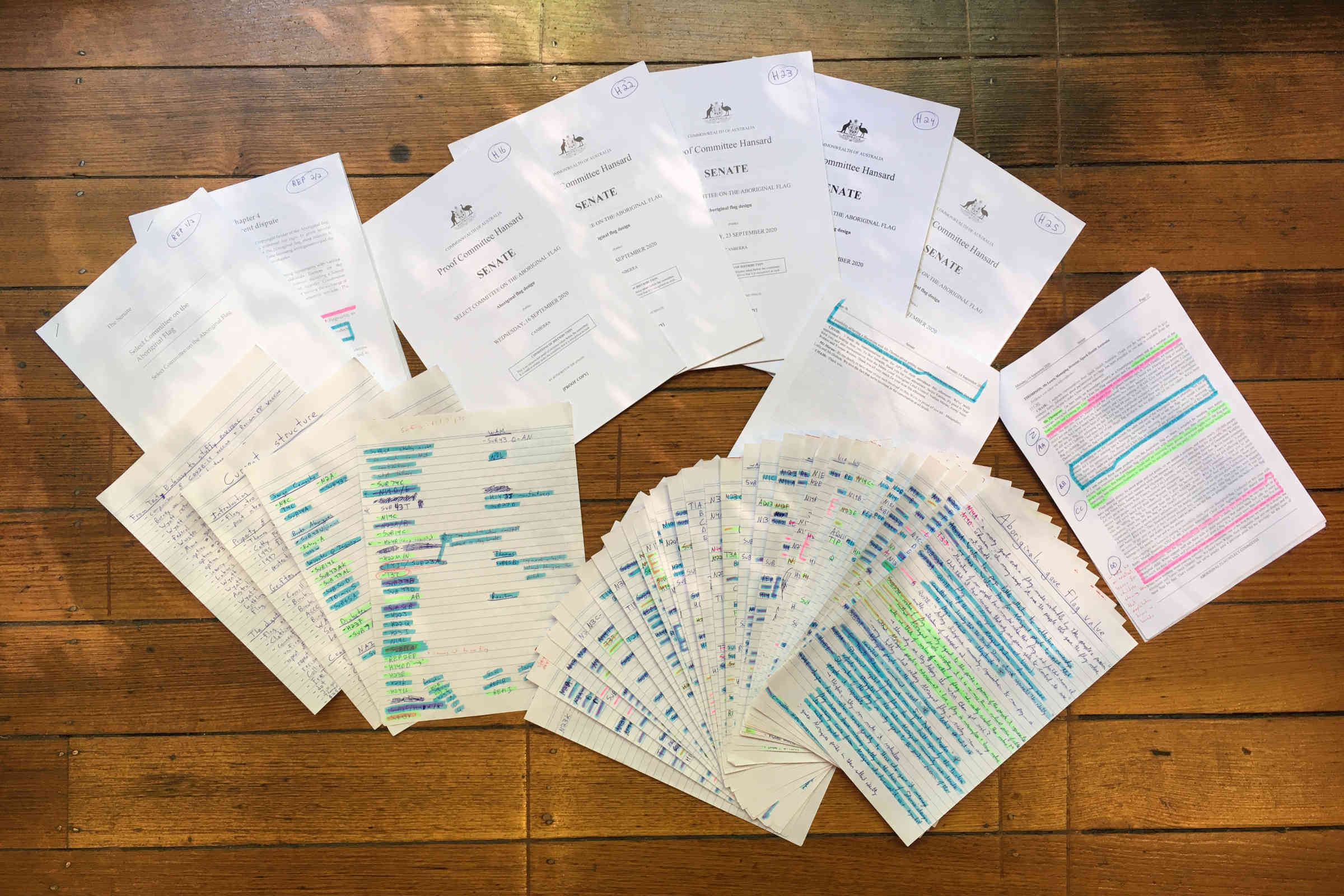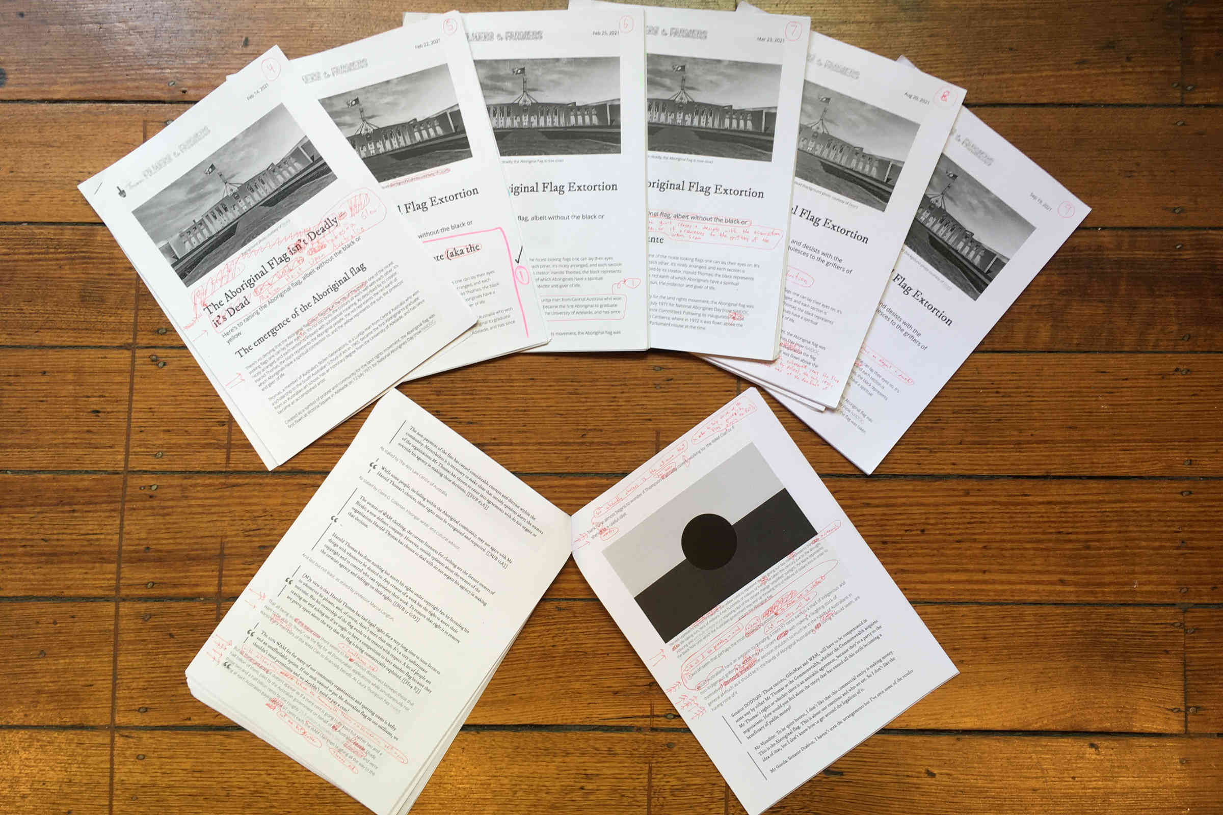 While the above pictures are some of the research material, notes (double-sided) and drafts from FF2F's recent post on the Aboriginal flag, the mostly analog workflow was as follows: