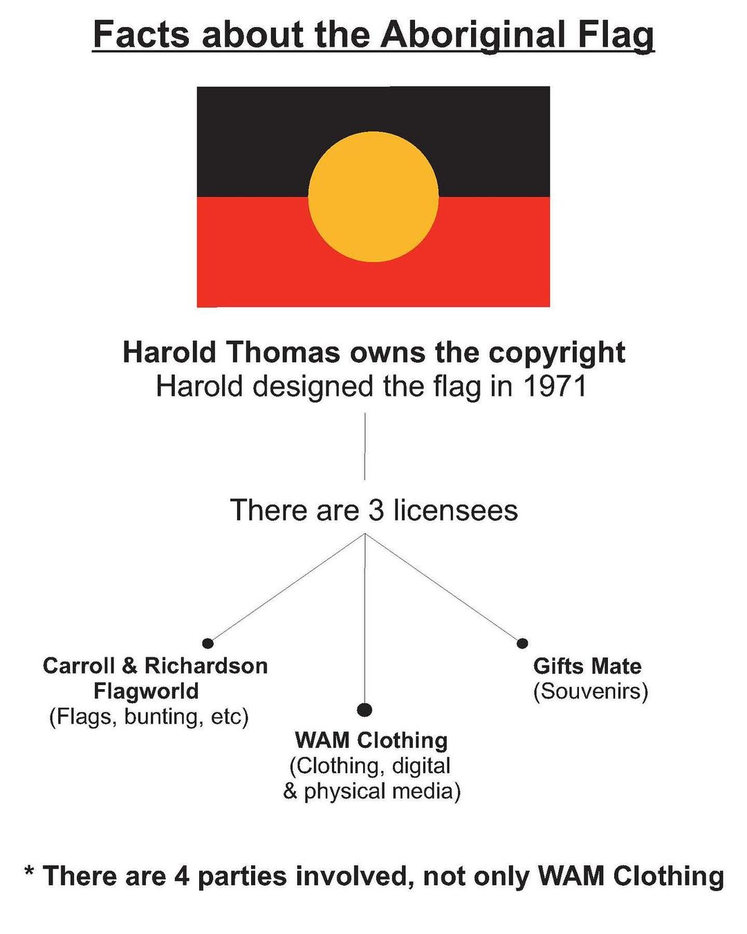 Putting aside rumours and any innuendo, while Wooster and Moore are WAM's two directors, Moore is claimed to be the majority shareholder. Following WAM Clothing's registration with ASIC on 21 November 2018,10 on 23 November 2018 Thomas signed with WAM Clothing the aforementioned new exclusive licence for usage of the flag on clothing (presumably after somehow cancelling his agreement with Gooses T-Shirts). While WAM Clothing has no business dealings with anything other than the Aboriginal flag,11 it pays licence fees and ongoing royalties to Thomas (in accordance to terms in their confidential agreement), royalties he wasn't for the most part getting from the majority of companies illegally reproducing the Aboriginal flag. As Moore described it herself,