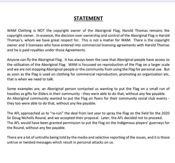 That being said, WAM Clothing has however issued a statement via an image capture on its Instagram page, stating that "an Aboriginal person contacted us wanting to put the Flag on a small run of hoodies as gifts for elders in their community – they were able to do that, without any fee payable."