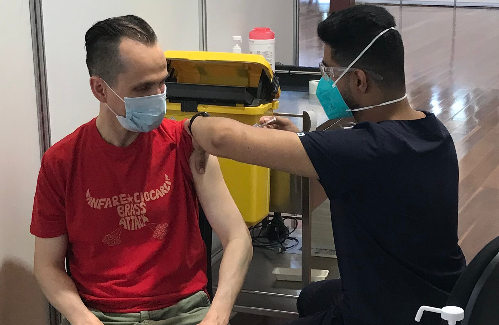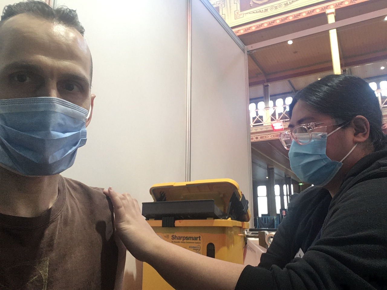 First Pfizer shot, June 2nd, my birthday. Literally the first selfie I've ever taken in my life, which I royally screwed up. Didn't even know how to flip to the front camera. Second Pfizer shot, July 9th. I've learned how to switch to the front selfie camera, but don't quite have the timing thing down right. Third Pfizer shot, December 14th. I say "stuff this" and was able to get staff to allow a friend of mine to take the photo. Note: Yes, I am in fact wearing my Fanfare Ciocărlia t-shirt, rumour being that, with they literally being the fastest and most powerful band in the world, wearing their t-shirt while getting your COVID shot makes the vaccine work that much faster and stronger. Also, yes, I'm wearing a surgical mask in all three photos, which one is unfortunately made to wear instead of whatever you come in with. (Third photo by maker of F**k the Game)